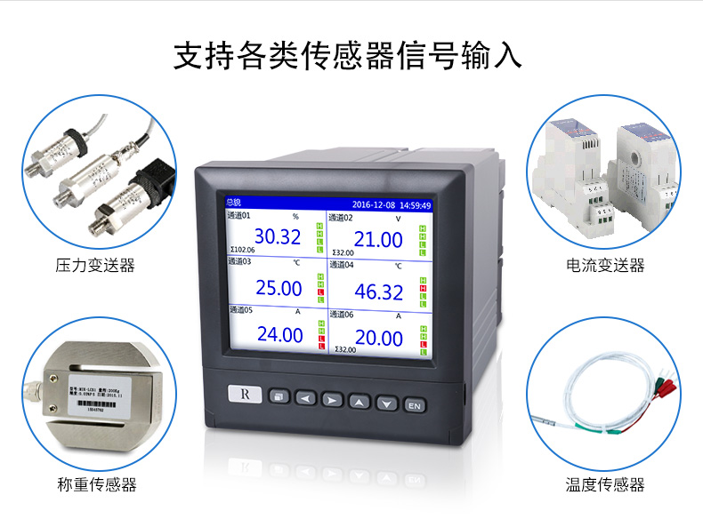 無紙記錄儀是將采集的數據/運算數據以時間為基軸記錄在儀器內部的存儲系統中,無消耗任何常用的記錄設施,如:紙張、筆墨。記錄在儀器內部的存儲數據,通過運算、模擬后顯示在液晶屏。常用顯示用液晶屏比較廣泛。在液晶屏屏幕上,可以顯示數字顯示、棒圖顯示、曲線顯示、報警列表等。無紙記錄儀采集的數據,常用的有:溫度、壓力、流量、液位、電壓、電流、濕度、頻率、振動、轉速等。