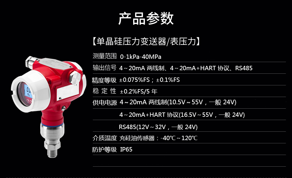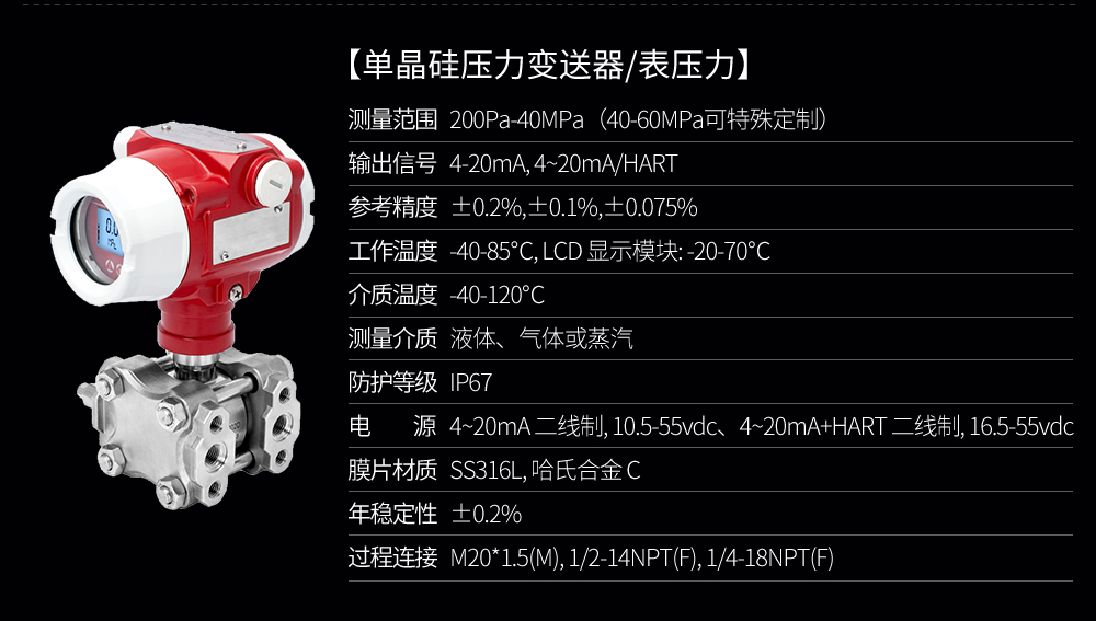 單晶硅壓力變送器用于測量液體、氣體或蒸汽的液位、密度、壓力,然后將其轉變成4-20mAHART電流信號輸出